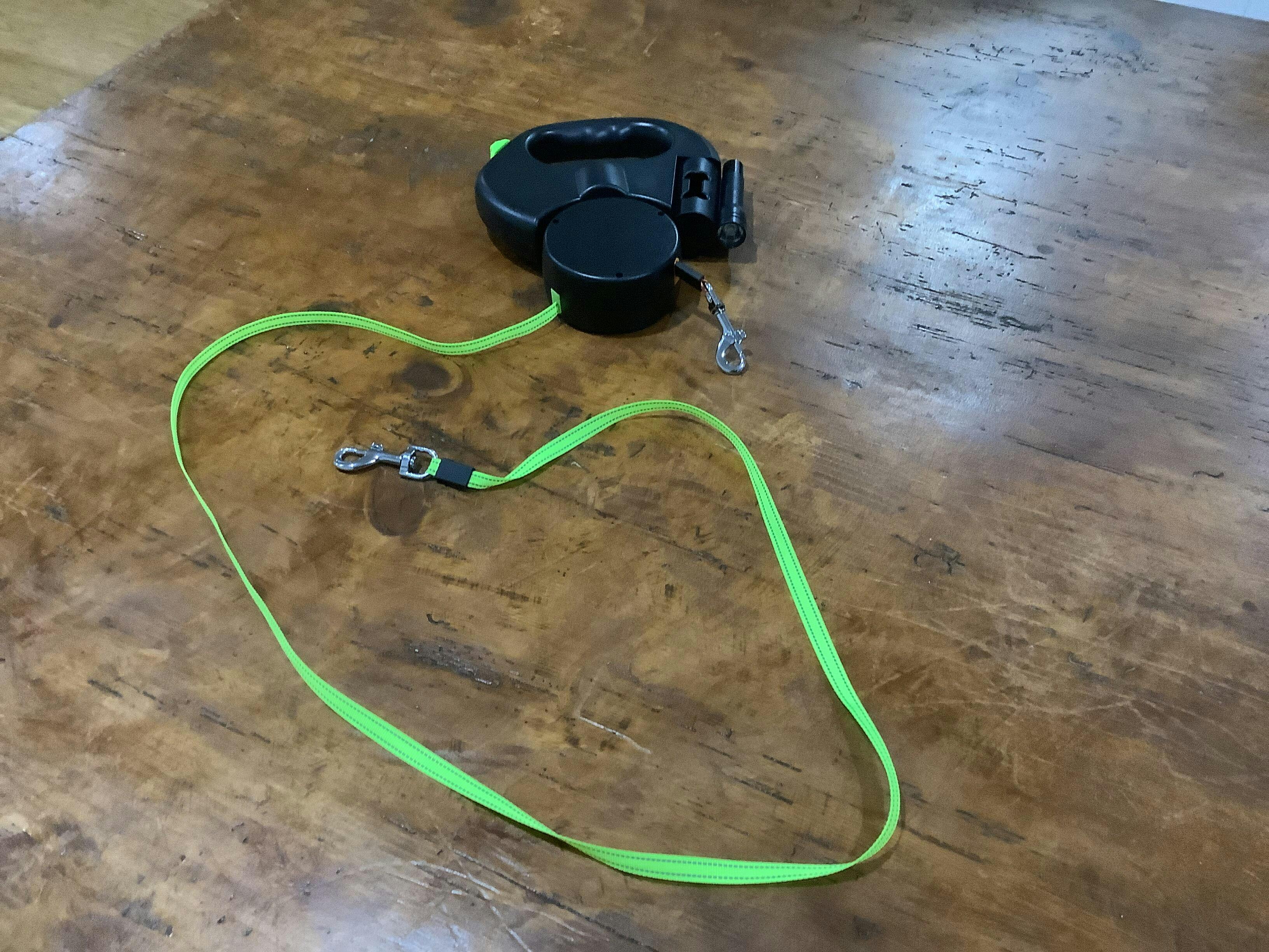 The ergonomic, gel-grip handle fits naturally in your hand. Giving you comfort and control even on longer walks. Reflective leads and LED light keep you visible and safe in the dark. Each retractable leash extends smoothly up to 10 feet. Perfect freedom with perfect control. A discreet built-in compartment keeps a roll of bags handy. Now you can take care of business with one hand while keeping the other on the lead.
